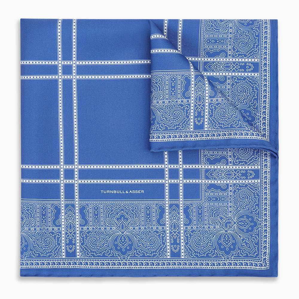 A celebration of craft and creativity, our pocket squares are designed to infuse heritage-inspired character to modern tailoring. This style is meticulously handcrafted in England from pure silk, showcasing an intricate paisley bandana pattern rendered in contrasting avio blue and white. Finished with softly rolled edges, it offers an artful touch that pays enduring tribute to the artisanal techniques dear to Turnbull & Asser.