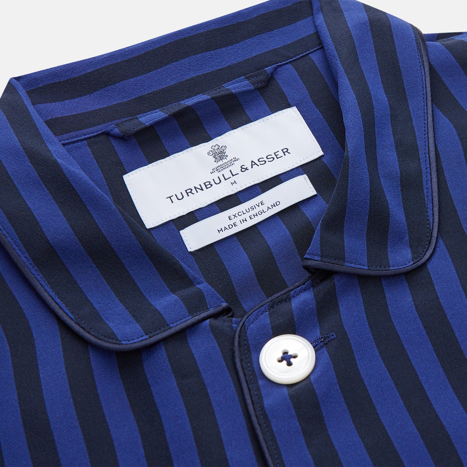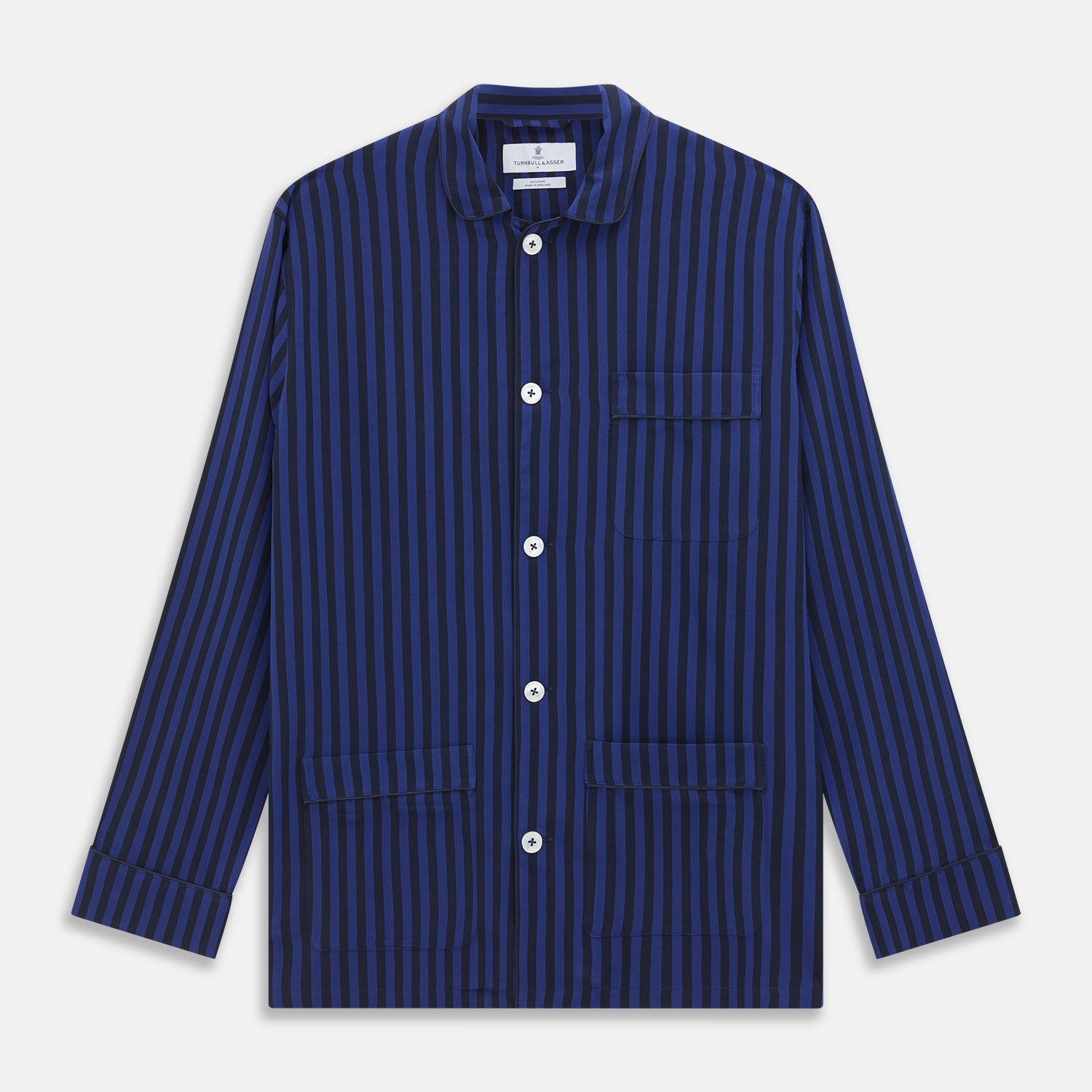 Our modern fit Hyde pyjamas, cut in a slightly slimmer fit than our traditional pyjamas, feature a camp collar shirt with three patch pockets and a pair of drawstring waist trousers. Crafted in the UK from a soft silk blend, this stylish blue and navy candy stripe pattern offers a contemporary yet timeless approach to sleepwear.