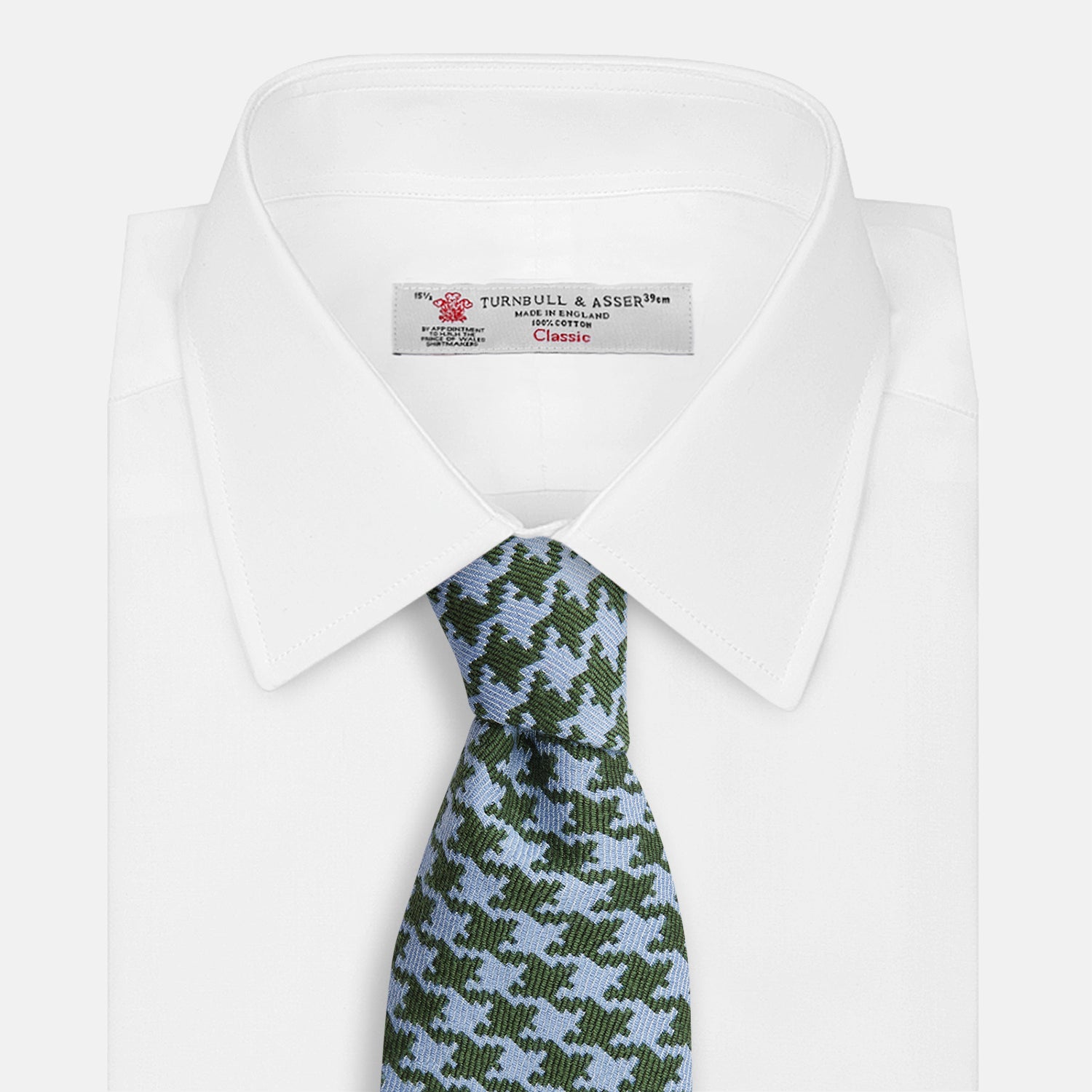Hand-finished from unique silk and wool blend by a team of passionate specialists, this tie features a blade width of 9.5cm, a self-tipped blade, delicate slip-stitching along its entire length and a classic large houndstooth pattern that will bring to life any ensemble. Pair this green and blue tie with a shirt and blazer for a classically bold Turnbull look.