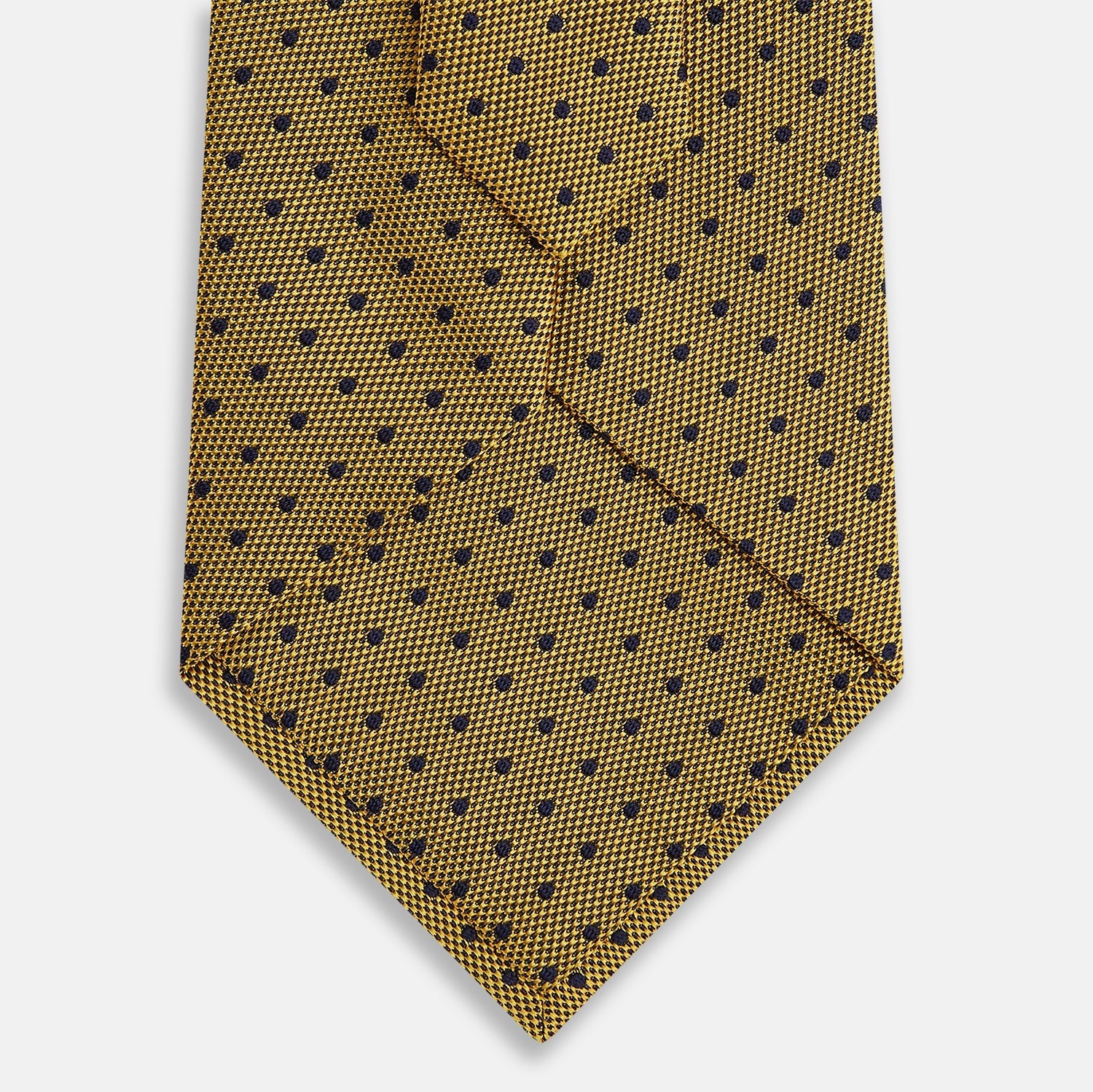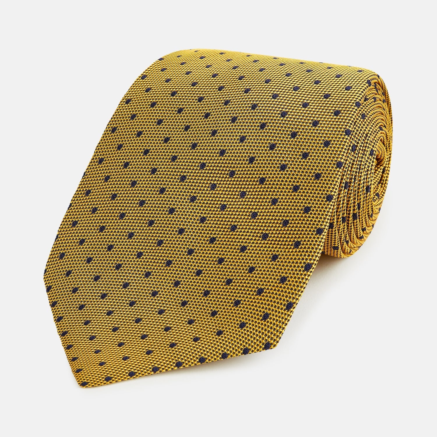 A handsome spotted silk tie is an essential addition to your wardrobe. This purple and yellow iteration is an enduring accessory for smarter attires. Complete it with your favourite crisp shirt for a look that commands attention.